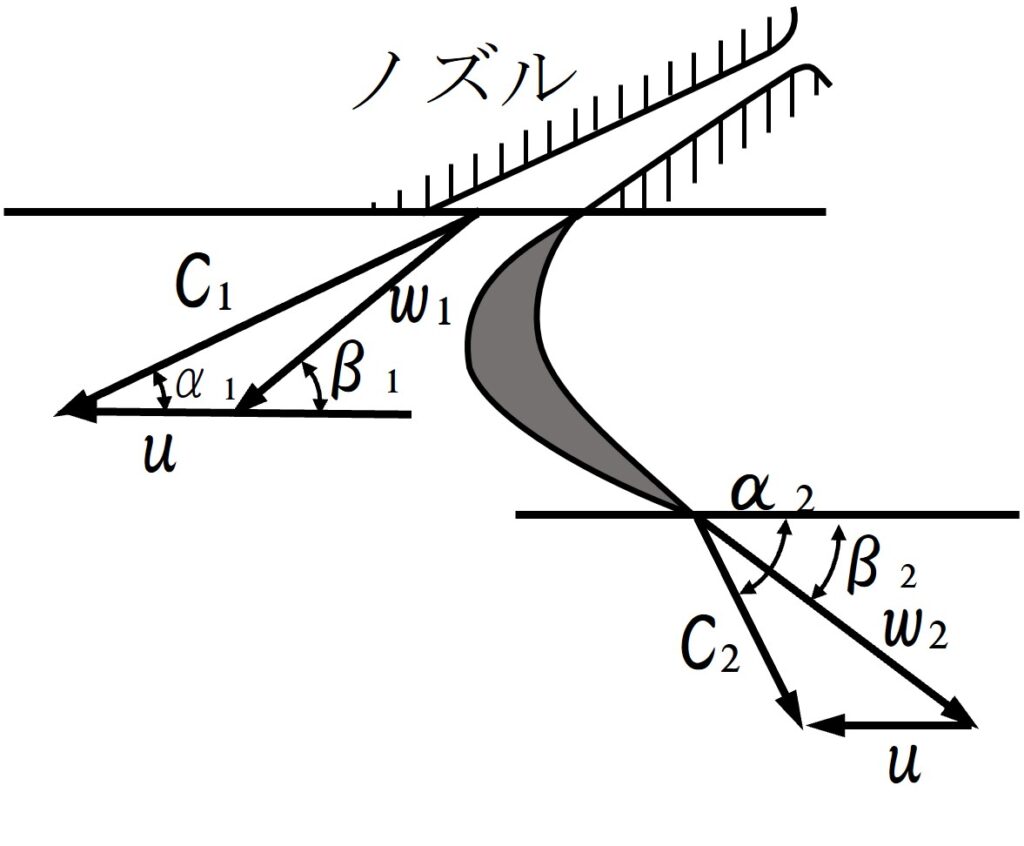 (2) 動翼入口角を[ ㋔ ]に等しくとれば,蒸気は動翼に衝突することなく円滑に流入する。また,蒸気は動翼通過中に方向転換して,一般に動翼出口角[ ㋕ ]に等しい角度で流出し,そのときの動翼出口の相対速度[ ㋖ ]と周速度㋒をベクトル的に加えることによって動翼出口の絶対速度[ ㋗ ]を描くことができる。
