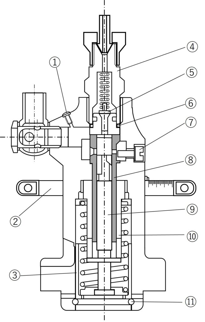 (1) 送出し弁④は,燃料噴射弁の油の切れをよくするため,どのような形状としているか。(略図を描いて説明せよ。)【出題:H24/04,H27/07,H29/04】