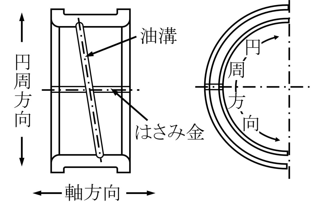 (1) 油溝を円周方向に設ける場合,軸心に直角にせず図のように斜めにする場合の利点は,何か。また,油溝は,軸方向に設けないほうがよいのは,なぜか。
