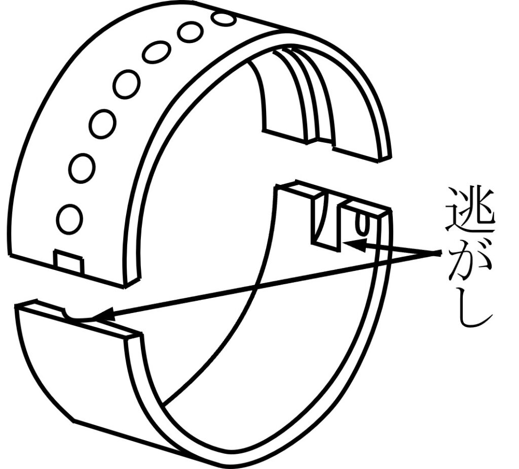 (3) 大形機関の場合,図のように,軸受上下メタルの合わせ面を油隙間量の半分程度当たりを逃がすのは,なぜか。