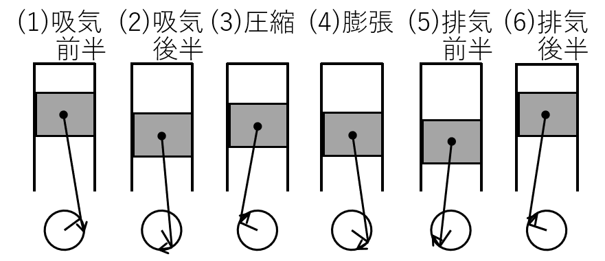 (3) 図はピストンとクランクの位置を示す。図の①~⑥の各位置においてピストンに働くガス圧と慣性力の合成力が上向きとなるのはどれか。また,ピストンの側圧が左方向に作用するのはどれか。(それぞれ番号で示せ。)