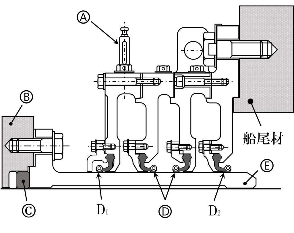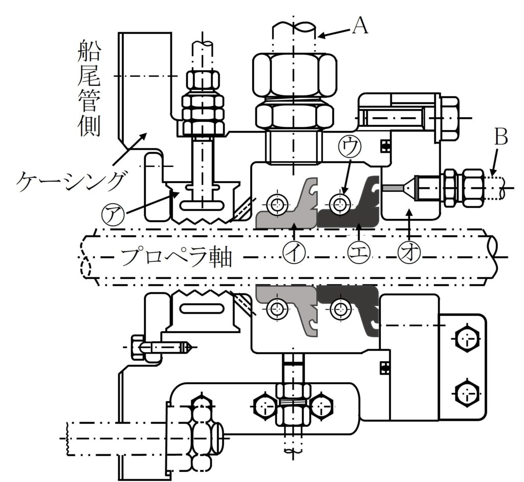図は,上架中における油潤滑式船尾管の後部シール装置を示す。図に関する次の問いに答えよ。