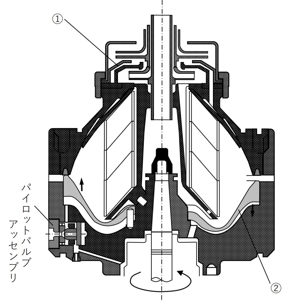 図は,弁排出形遠心油清浄機(分離板形)の上部構造の略図である。図に関する次の問いに答えよ。