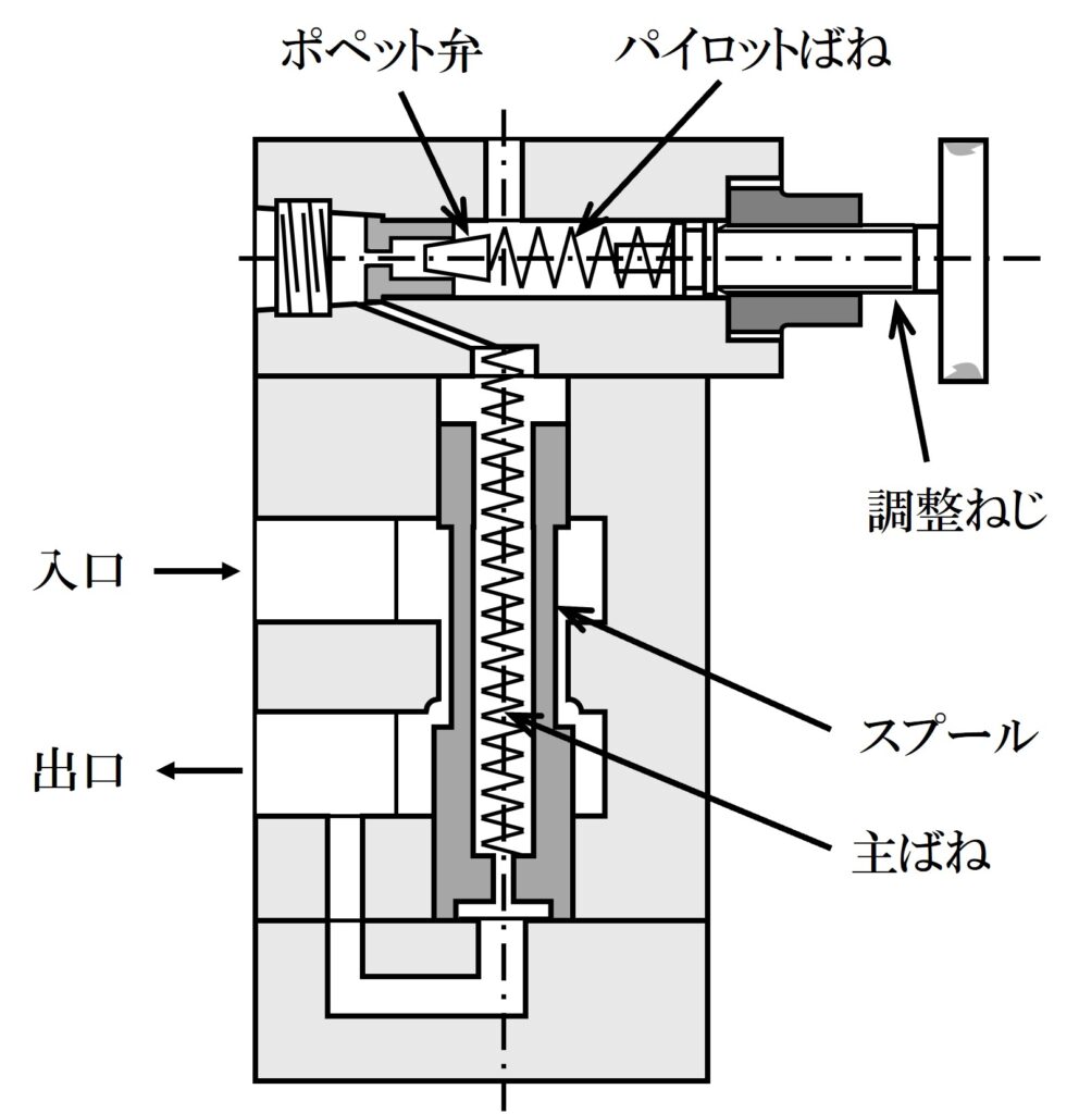 (1) 出口圧力が設定圧力以下のときは[ ㋐ ]は閉じたままなので,スプールの両端の[ ㋑ ]は同一となり,[ ㋒ ]の作用によりスプールは下方へ押し下げられ,流入した油は,ほとんど抵抗なく出口側に流れる。
