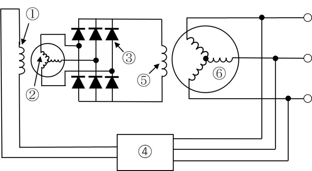 図はブラシレス同期発電機の基本回路図を示す。図に関する次の問いに答えよ。