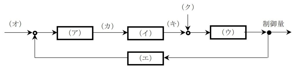 図は,フィードバック制御の基本的なブロック線図を示す。図に関する次の問いに答えよ。