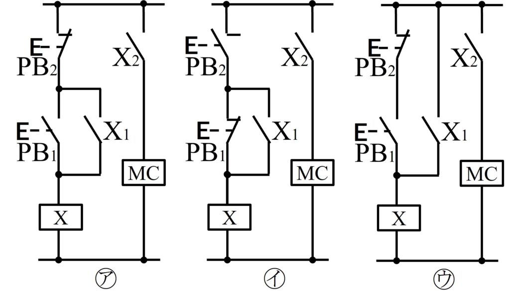 図は,電動機の押しボタン式発停回路の一部を示す展開接続図である。図に関する次の問いに答えよ。